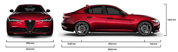 The dimensions of the Alfa Romeo Giulia are 4643 mm in length, 1450 mm in height, and 2024 mm in width, offering both performance and style for a unique and unmatched presence on the road. The boot has a maximum capacity of 480 litres. The car is available with 18" and 19" alloy wheels.